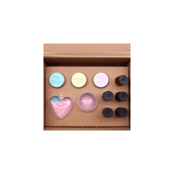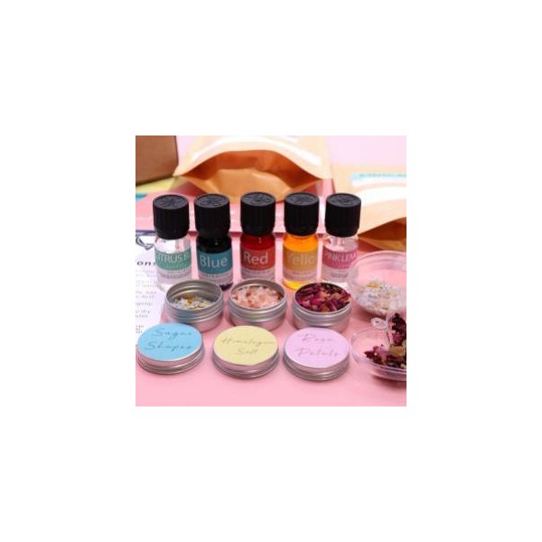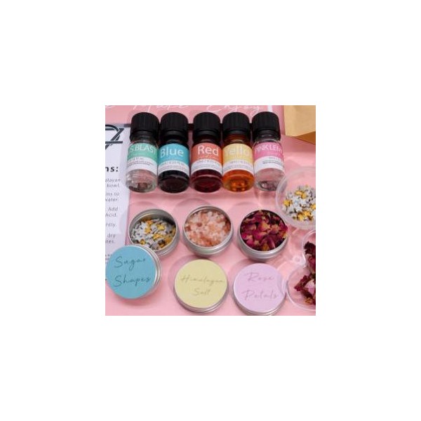 Pétalas de rosa, formatos divertidos de açúcar, 500g de sal do Himalaia, 200g de ácido cítrico, 2 moldes diferentes para bombas de banho, 2 aromas incríveis, 3 corantes primários e instruções passo a passo.