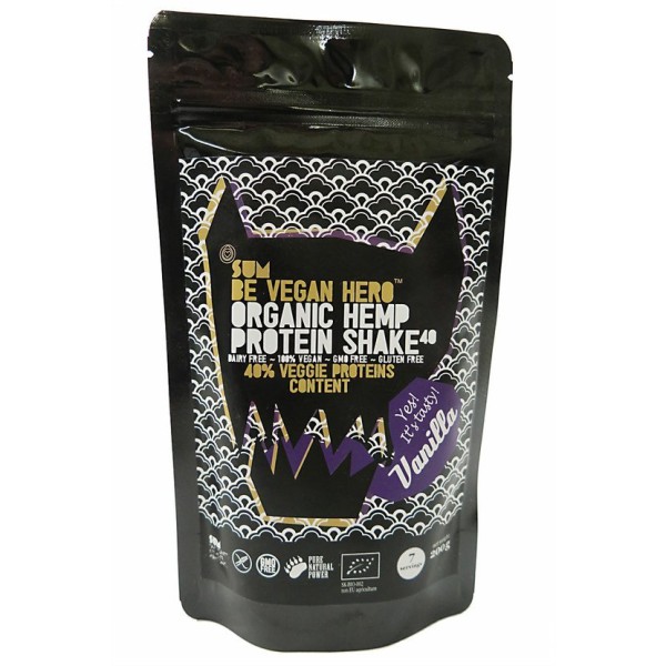 SUM BE VEGAN HERO VANILLA nutritiva BIO proteína de cânhamo com extrato de baunilha. Suavemente adoçado com néctar de flores de coco. Saborosa e nutritiva, preparo rápido! 40% de teor de proteína.
