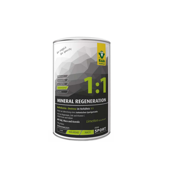 INDICAÇÕES: Mineral Regeneration de Raab com goji, maca e acerola, é um pó para a preparação de uma bebida isotónica. Pode tomar-se durante ou depois do treino, como fonte rápida de energia, uma vez que contém dextrose (um hidrato de carbono simples) e maltodextrina (um hidrato de carbono complexo), em proporções iguais de 1:1. Ainda que estes componentes difiram na sua estrutura (a dextrose é um monossacárido e a maltodextrina é um polissacárido), ambos têm um elevado índice glicémico (GI). Quem pratica muito desporto ou esforço físico, perde líquidos e minerais, através do suor. Com Raab Mineral Regeneration é conseguida uma relação equilibrada de hidratos de carbono e eletrólitos de sódio (365 mg por dose diária). É também rico em magnésio, zinco e vitamina C, e contém ferro e potássio. As soluções de hidratos de carbono e eletrólitos contribuem para a manutenção da resistência durante treinos prolongados e melhoram a absorção de água durante o esforço físico. O conteúdo de magnésio apoia o equilíbrio eletrolítico. O potássio e o magnésio contribuem para uma função muscular normal. O ferro apoia a criação normal de glóbulos vermelhos e hemoglobina. Ajuda ainda a diminuir o cansaço e a fadiga. A vitamina C da acerola facilita a absorção do ferro. O zinco apoia uma função normal do sistema imunitário.